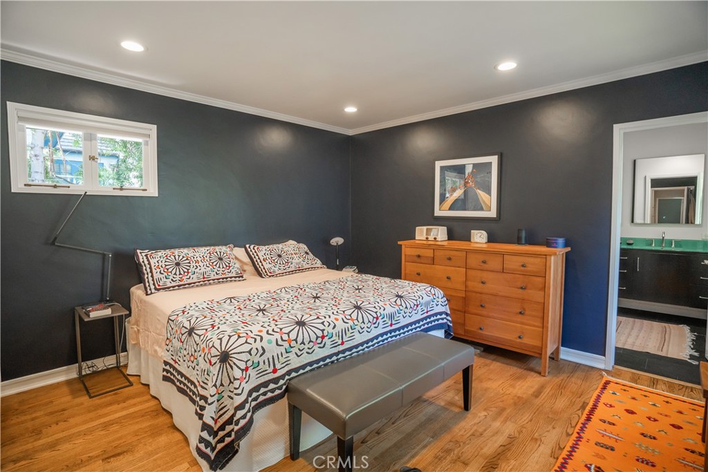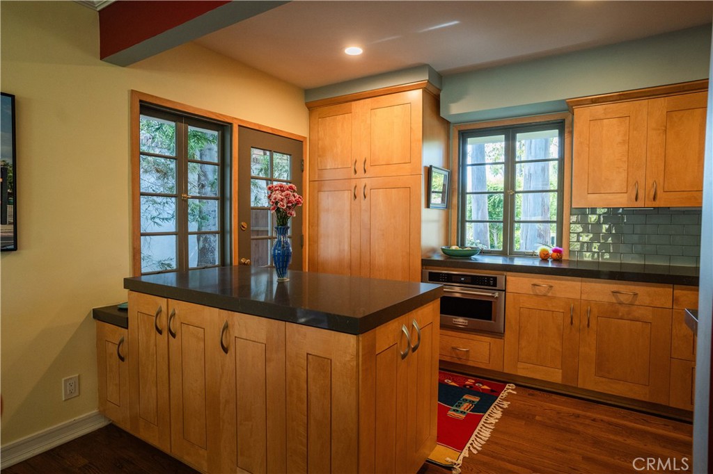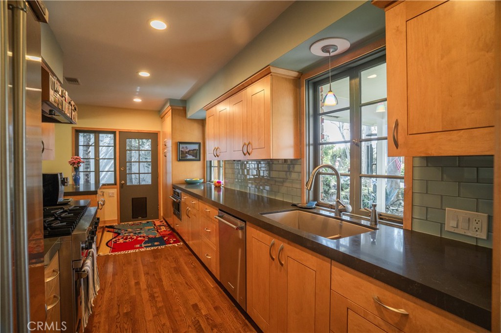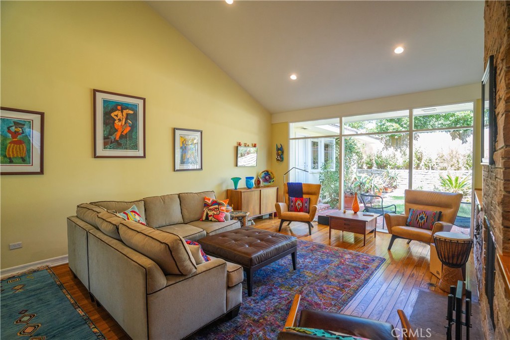 Idyllic Valmonte Grove Retreat. Tucked away on one of the most sought-after streets in the coveted Valmonte Grove neighborhood, this single-level sanctuary blends mid-century charm with modern comfort—all set directly along the serene boundary trail. Nestled behind a lush grove of eucalyptus trees on a generous 7,500 sq. ft. lot, this home feels worlds away while remaining close to everything. Step inside to a sun-drenched, sunken living room, where hardwood floors, soaring vaulted ceilings, and a wood burning stone fireplace create a warm, inviting centerpiece. Floor-to-ceiling windows frame views of the private, fully fenced backyard and garden, making the space perfect for both quiet mornings and lively entertaining. The open-concept dining room and spacious kitchen flow naturally off the living room, offering hillside and golf course views. The chef’s kitchen, fully remodeled in 2017, boasts a 6-burner Viking range, high-end appliances, custom maple cabinetry, and abundant storage. A step-down den (ideal for a music room, playroom, or cozy lounge) opens through four large French doors into the tranquil backyard. The home’s three bedrooms extend along the west hall, culminating in a peaceful primary suite complete with a Dutch door opening onto the garden. The modernist bathroom, beautifully renovated in 2019, features a marble walk-in shower, glass countertop vanity, stained glass window, and an abundance of natural light. Additional features include: Attached 2-car garage with laundry Extended driveway for up to 3 additional cars New roof, on-demand hot water heater, whole-house water filter, and built-in dehumidifier Enjoy hillside and golf course views from the elevated front porch, or relax in the private backyard oasis—perfect for families, pets, and summer gatherings. This is more than a home; it’s a lifestyle. Valmonte Grove offers peaceful, tree-lined seclusion while being just minutes from Riviera Village and a quick 4-minute bike ride to the beach.