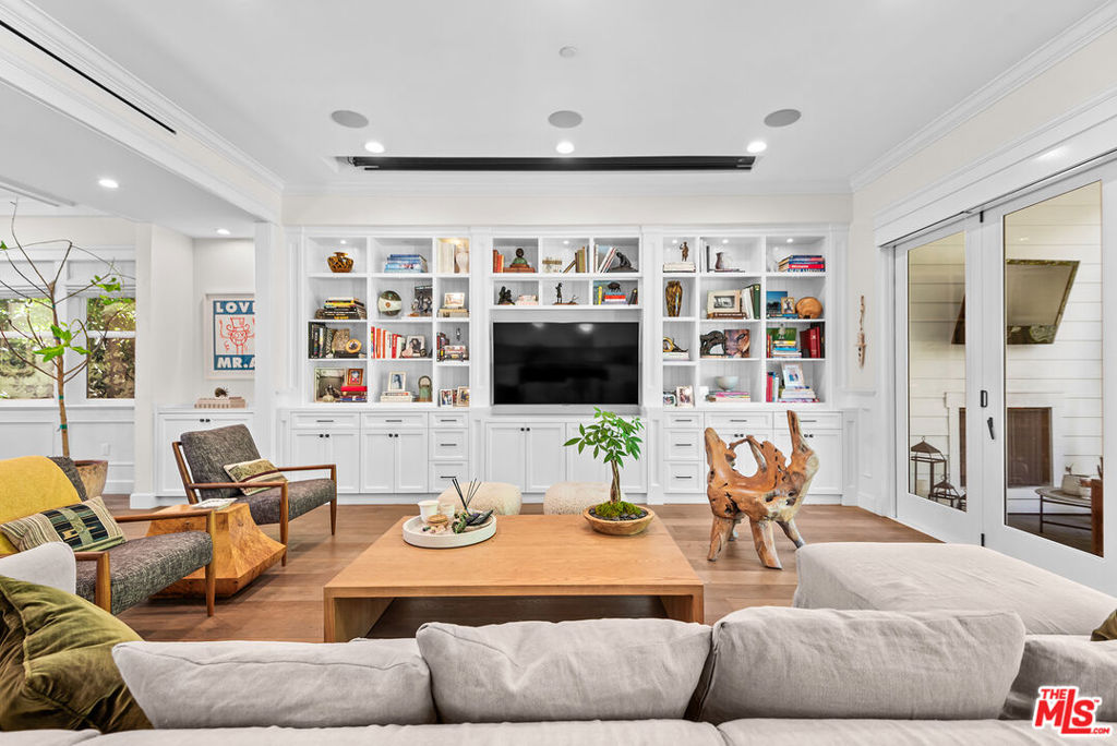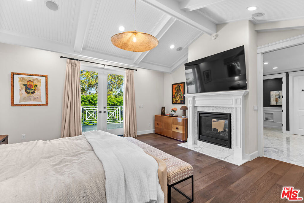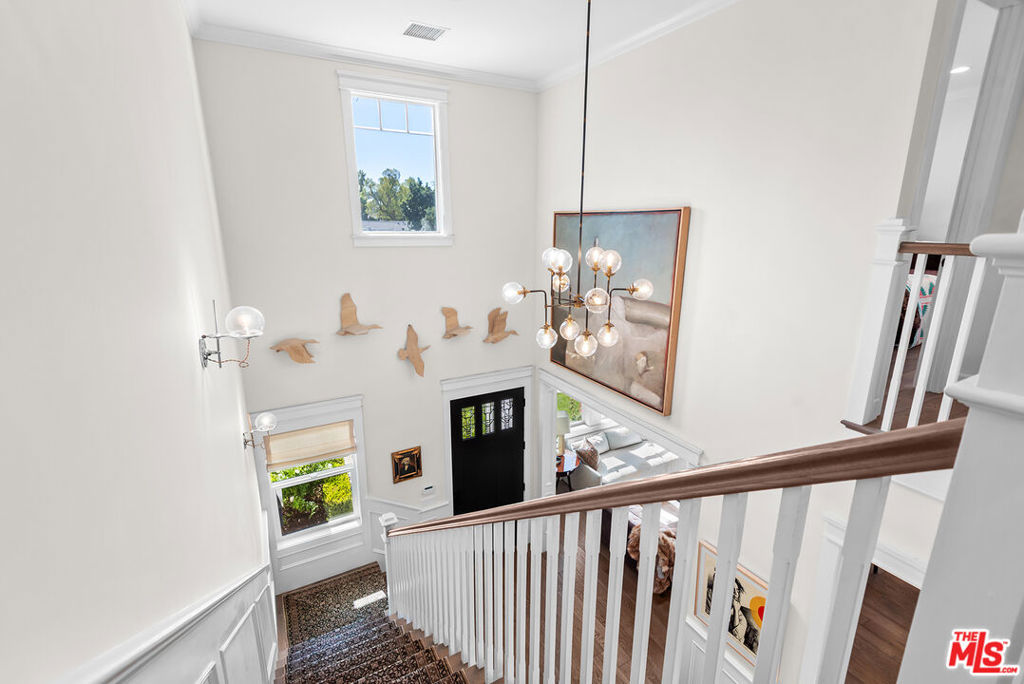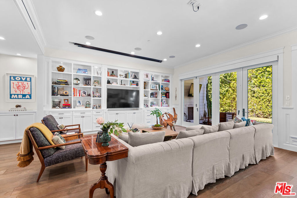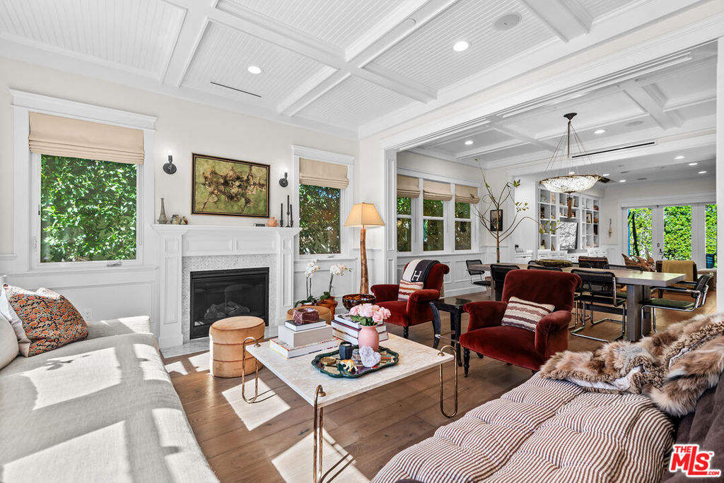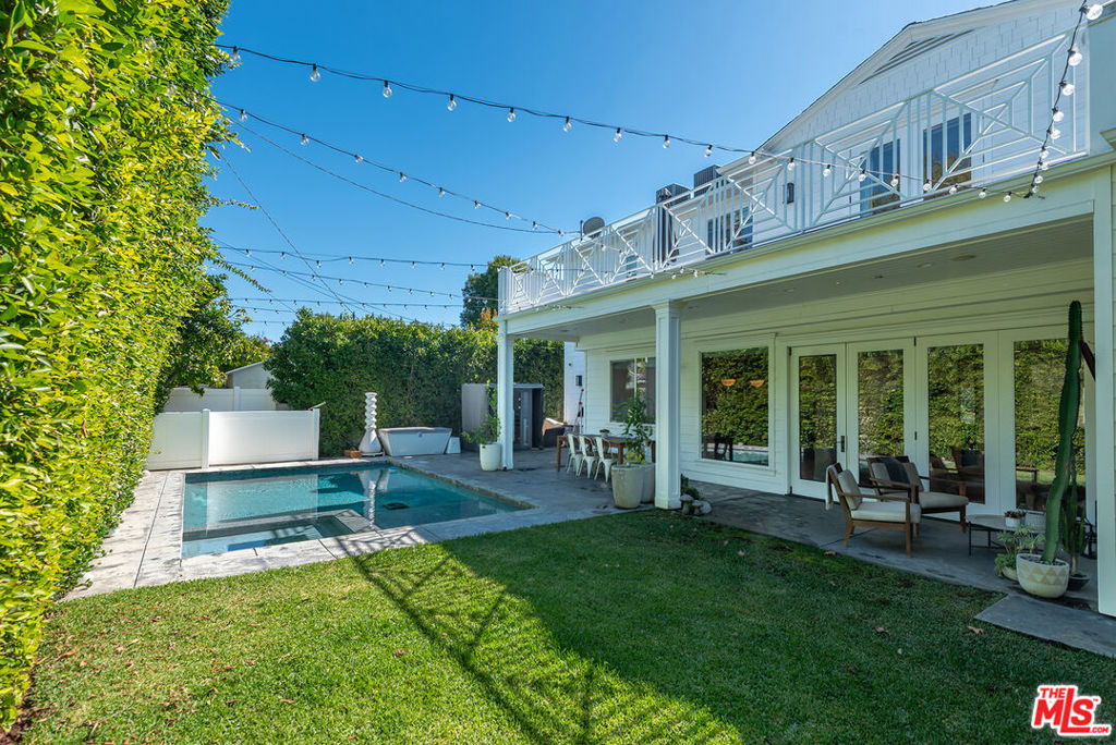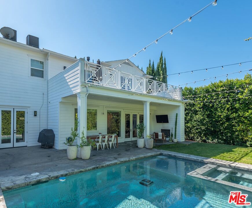 Nestled within the highly sought-after Fashion Square neighborhood of Sherman Oaks, this fabulously chic 2015 East Coast Traditional perfectly blends timeless elegance with contemporary comfort. The home is introduced by inviting curb appeal and thoughtfully designed landscaping that set a warm, welcoming tone. A grand entry with soaring ceilings and abundant natural light opens to an airy layout designed for modern living. The formal living room flows effortlessly into a spacious dining room, ideal for entertaining. The well-appointed chef's kitchen features beautifully crafted cabinetry, a large center island, and a full Thermador stainless-steel appliance package. The adjoining family room, complete with 3D projector and 135-inch screen with blackout shades, offers a cinematic experience. Accordion glass doors open to a private backyard oasis featuring a sparkling pool, large patio with fireplace, and lush greenery creating a seamless indoor-outdoor living experience. Offering four bedrooms and four baths, including one conveniently located on the main level, the home combines functionality with elevated style. The primary suite is a true retreat, showcasing vaulted ceilings, a dual-sided fireplace connecting to a spa-like bath, an oversized walk-in closet, and French doors leading to a spacious private balcony. Additional highlights include extensive custom built-ins and cabinetry, a wine closet, large pantry, upstairs landing with "Genius Bar" style workstations, surround sound throughout, custom linen window coverings, designer lighting by Schoolhouse Electric, RH, Nickey Kehoe, Circa Lighting, and exterior fixtures by Amber Interiors. Other notable features include an EV charger, exterior security cameras, and Ring doorbell. This home radiates effortless sophistication and warmth - a perfect expression of modern California living infused with East Coast charm in one of Sherman Oaks' most coveted enclaves.