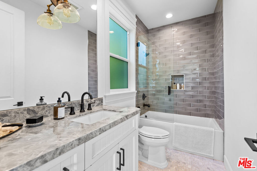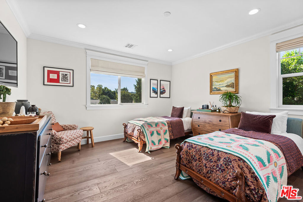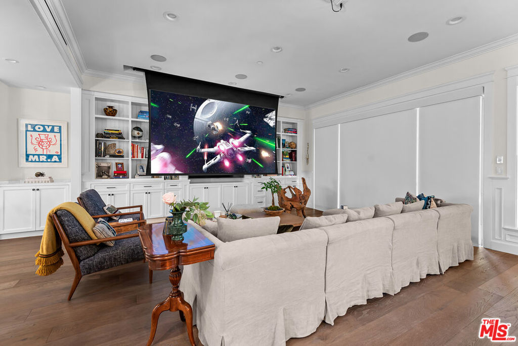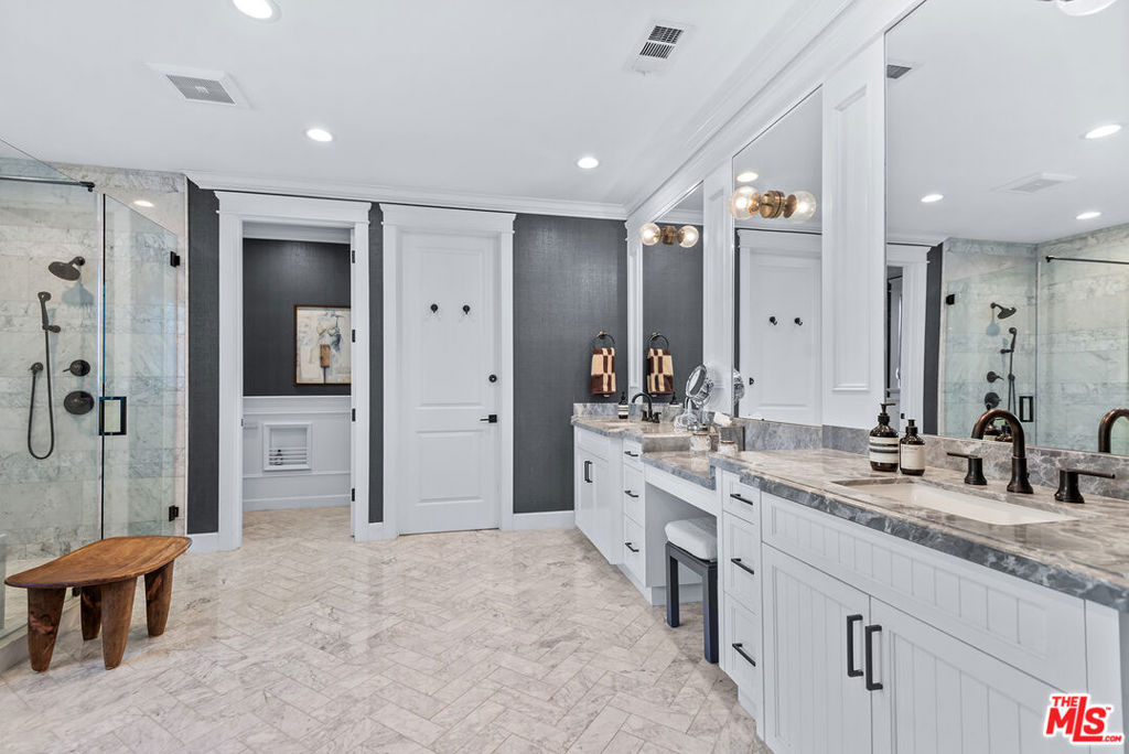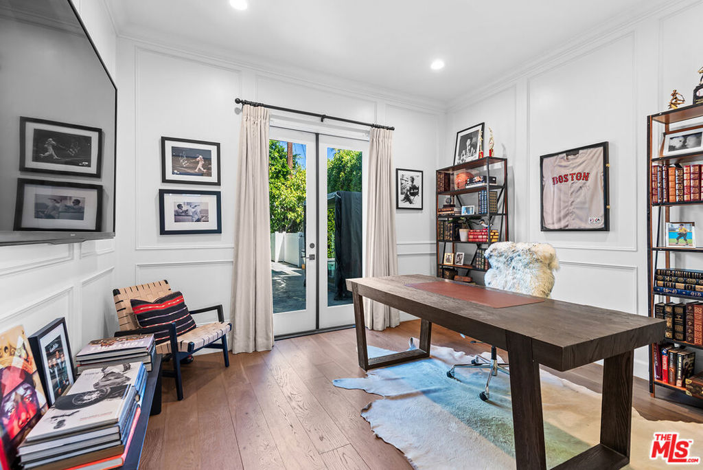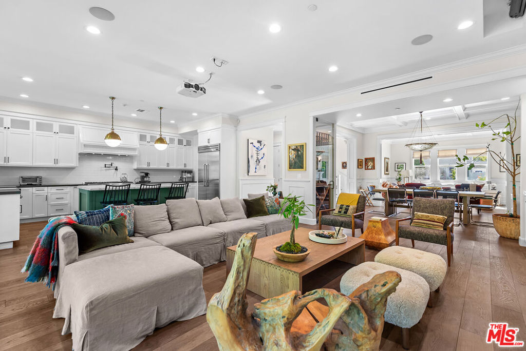 Nestled within the highly sought-after Fashion Square neighborhood of Sherman Oaks, this fabulously chic 2015 East Coast Traditional perfectly blends timeless elegance with contemporary comfort. The home is introduced by inviting curb appeal and thoughtfully designed landscaping that set a warm, welcoming tone. A grand entry with soaring ceilings and abundant natural light opens to an airy layout designed for modern living. The formal living room flows effortlessly into a spacious dining room, ideal for entertaining. The well-appointed chef's kitchen features beautifully crafted cabinetry, a large center island, and a full Thermador stainless-steel appliance package. The adjoining family room, complete with 3D projector and 135-inch screen with blackout shades, offers a cinematic experience. Accordion glass doors open to a private backyard oasis featuring a sparkling pool, large patio with fireplace, and lush greenery creating a seamless indoor-outdoor living experience. Offering four bedrooms and four baths, including one conveniently located on the main level, the home combines functionality with elevated style. The primary suite is a true retreat, showcasing vaulted ceilings, a dual-sided fireplace connecting to a spa-like bath, an oversized walk-in closet, and French doors leading to a spacious private balcony. Additional highlights include extensive custom built-ins and cabinetry, a wine closet, large pantry, upstairs landing with "Genius Bar" style workstations, surround sound throughout, custom linen window coverings, designer lighting by Schoolhouse Electric, RH, Nickey Kehoe, Circa Lighting, and exterior fixtures by Amber Interiors. Other notable features include an EV charger, exterior security cameras, and Ring doorbell. This home radiates effortless sophistication and warmth - a perfect expression of modern California living infused with East Coast charm in one of Sherman Oaks' most coveted enclaves.