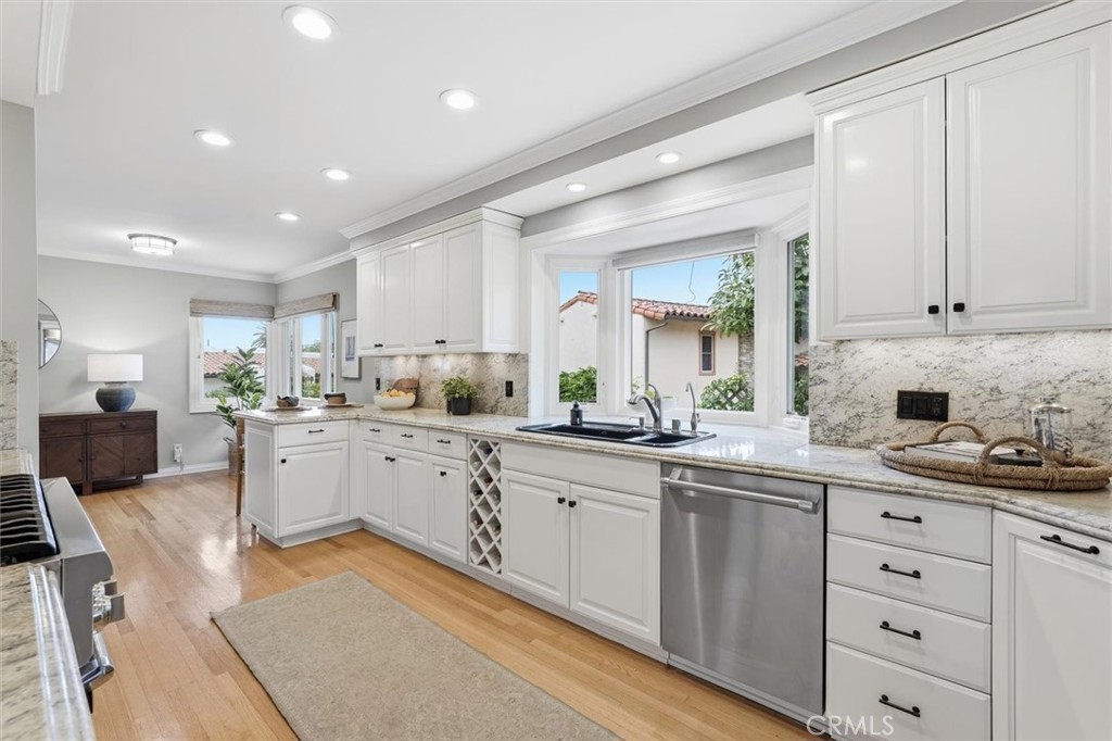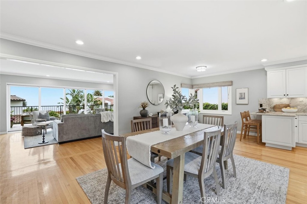 This beautifully updated Palos Verdes Estates home combines comfortable living with refined details and ocean views. Behind a gated entry, a private front courtyard offers a welcoming outdoor space with room for a dining table and grill setup—ideal for casual gatherings or quiet evenings at home. Inside, the open layout begins with a bright dining area that flows seamlessly into the remodeled kitchen. The kitchen features granite countertops, custom cabinetry, premium stainless-steel appliances including a 6-burner Thermador range and garden window. A small peninsula provides additional bar seating for casual dining. The adjoining living room serves as the heart of the home, featuring hardwood floors, fireplace and a dramatic retractable La Cantina glass door that opens to a deck finished with concrete and tile details. From here, you can enjoy partial ocean views and the refreshing coastal breezes that define Palos Verdes living. The main level also includes a tranquil primary suite with oversized windows, custom shutters and a private bath, along with a spacious second bedroom and a hallway bath offering dual sinks, a roomy glass shower and custom tilework. Downstairs, you’ll find a third bedroom, another full bathroom, laundry room and a versatile fourth bedroom with its own fireplace, sink, built-in cabinetry and sliding doors leading to the rear patio and grassy yard. This flexible space works perfectly as a second primary suite, media room or cozy family room. Additional highlights include a 3-zone A/C system with two condensers, updated windows and doors, and an EV charger in the attached two-car garage. Just minutes from Malaga Cove Plaza, scenic trails, award-winning schools, and pristine local beaches, this home offers a thoughtful blend of function, flexibility and the easy elegance that makes Palos Verdes Estates so desirable.