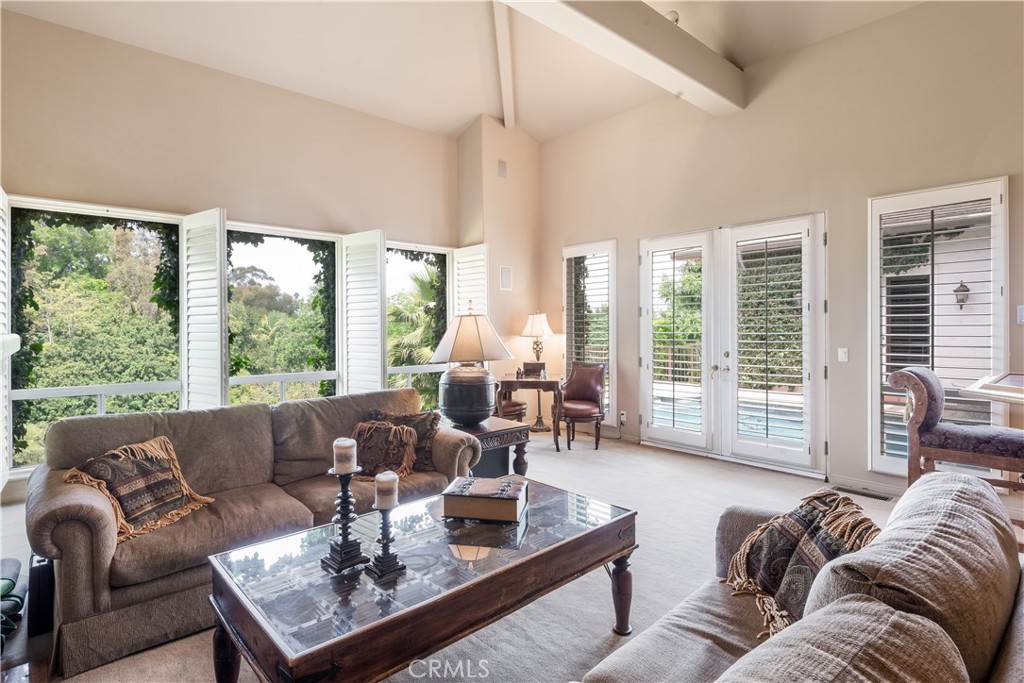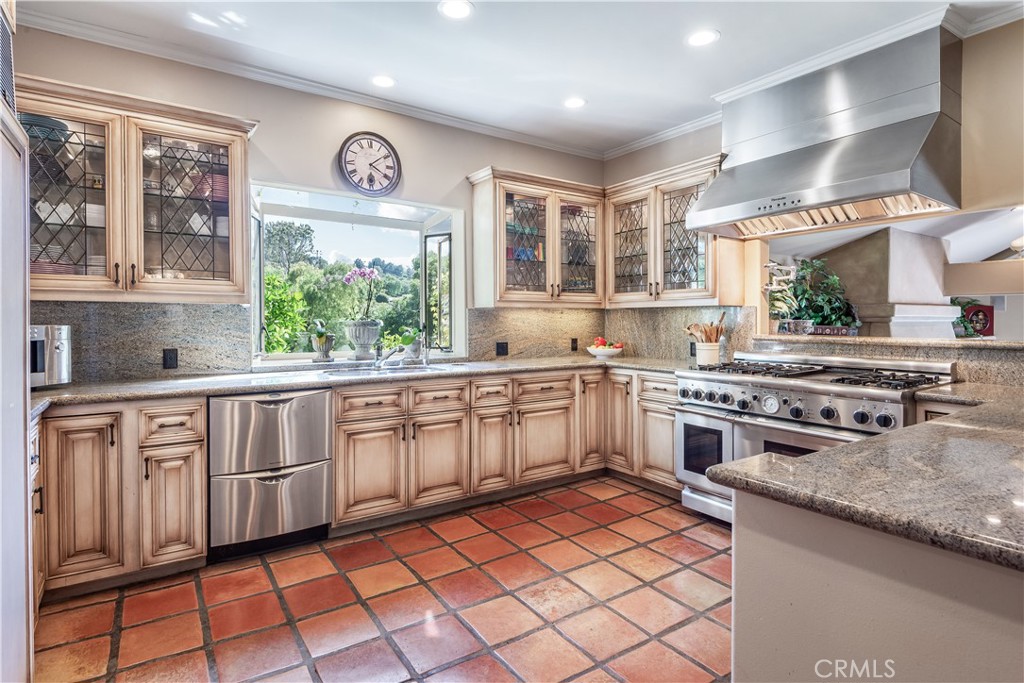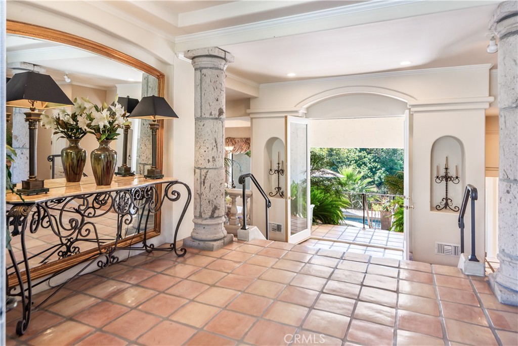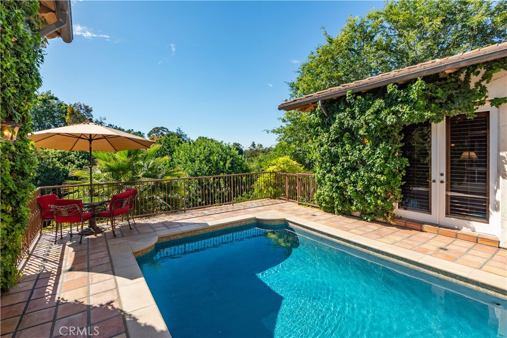 This gated custom estate blends European charm with refined California living. Elegant tile floors, stone accents, and architectural detail set the tone throughout. The living room features soaring ceilings and a stately fireplace, while the large formal dining room is ideal for entertaining. The kitchen blends warmth and functionality with custom cabinetry, granite countertops, and a professional-grade stainless steel range. The nearby family room features a fireplace, wet bar, and French doors that open to a charming courtyard patio with pool, spa, and a hidden sauna tucked into the corner. The secluded primary suite is a true retreat with its own fireplace, spa-like bath with jetted tub, sitting room with wet bar, walk-in closet, and a private veranda with hillside views. Additional features include an incredible temperature-controlled wine cellar, a detached guest house with kitchenette and loft, bocce court, putting green, and a 3-car garage with direct access. Solar panels with Tesla backup batteries add efficiency, while a long private driveway enhances the sense of privacy. A compelling blend of space, amenities, and seclusion in one of Rolling Hills Estates’ most desirable settings.